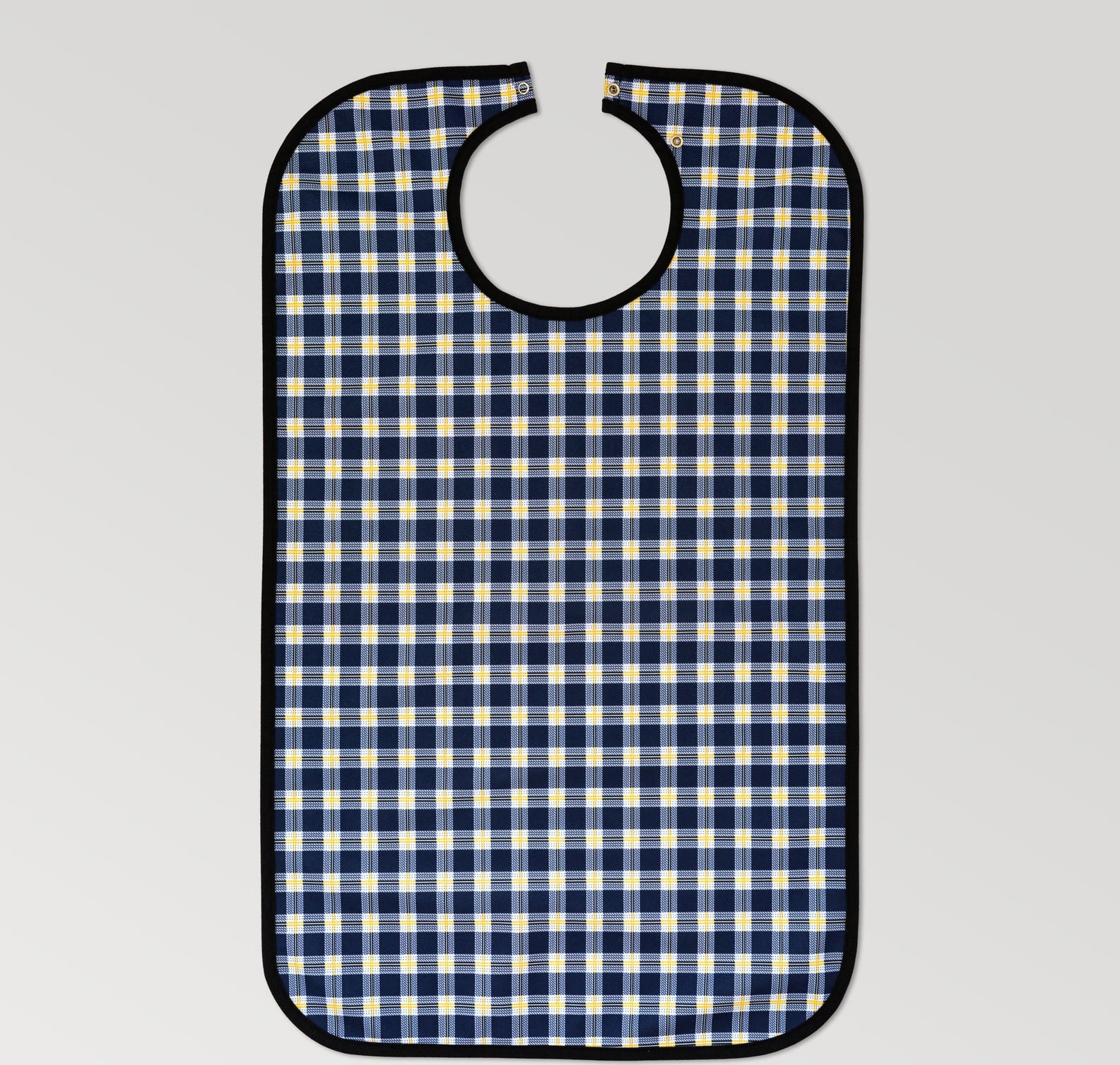 Babero adulto reutilizable con tejido y capa de PU que lo hace impermeable.